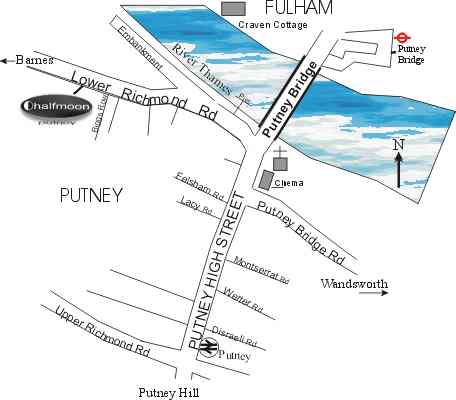 - From Putney Bridge tube (District Line): turn left then right, walking towards Putney Bridge Approach. Turn left down Putney Bridge Approach and walk over Putney Bridge (across the Thames). Take the first right down Lower Richmond Road and the Halfmoon is a 10 minute walk on the left-hand side.
